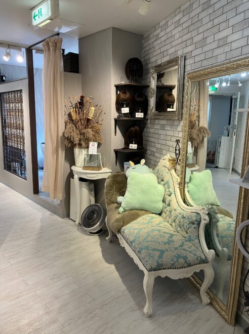 少し進むと受付のカウンターがあり、素敵なソファーの隣にウィッグが置いてあります。