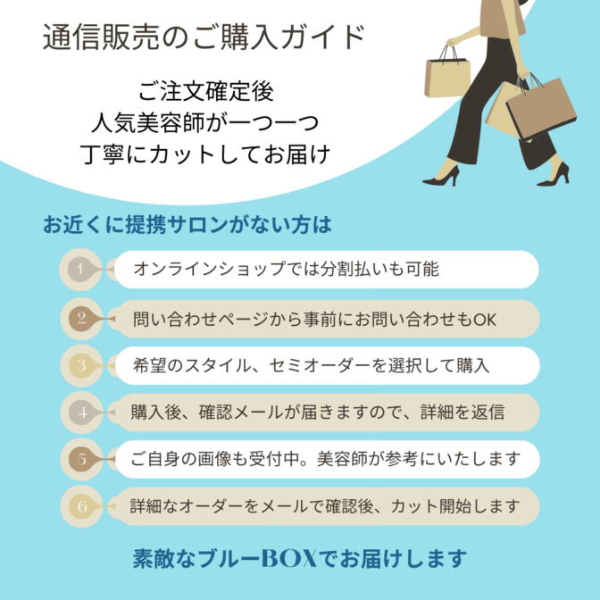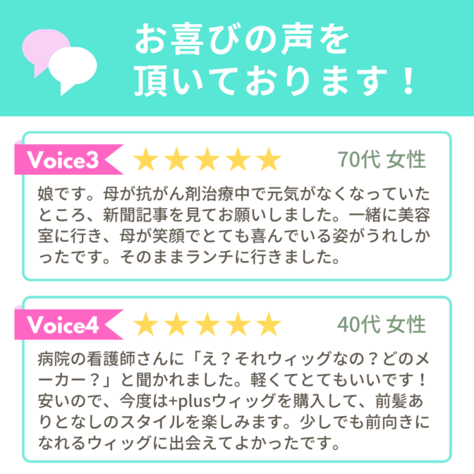 - ウイッグが届きました。ありがとうございます。今までの私の髪と変わらない感じのウイッグになっていたので違和感なくつけることが出来て嬉しく思います。 本当にありがとうございます。