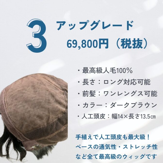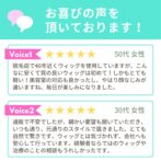 | その他 | コストパフォーマンス◎で、2個所有も可能。 | 人工頭皮が大きくアレンジの幅が広がった。 質と価格のバランスが 良いウィッグ。 | 長時間の使用も楽。 バージン毛を採用。 手植えでキューティクルの方向が一定なので、長期使用でも美しい。 |